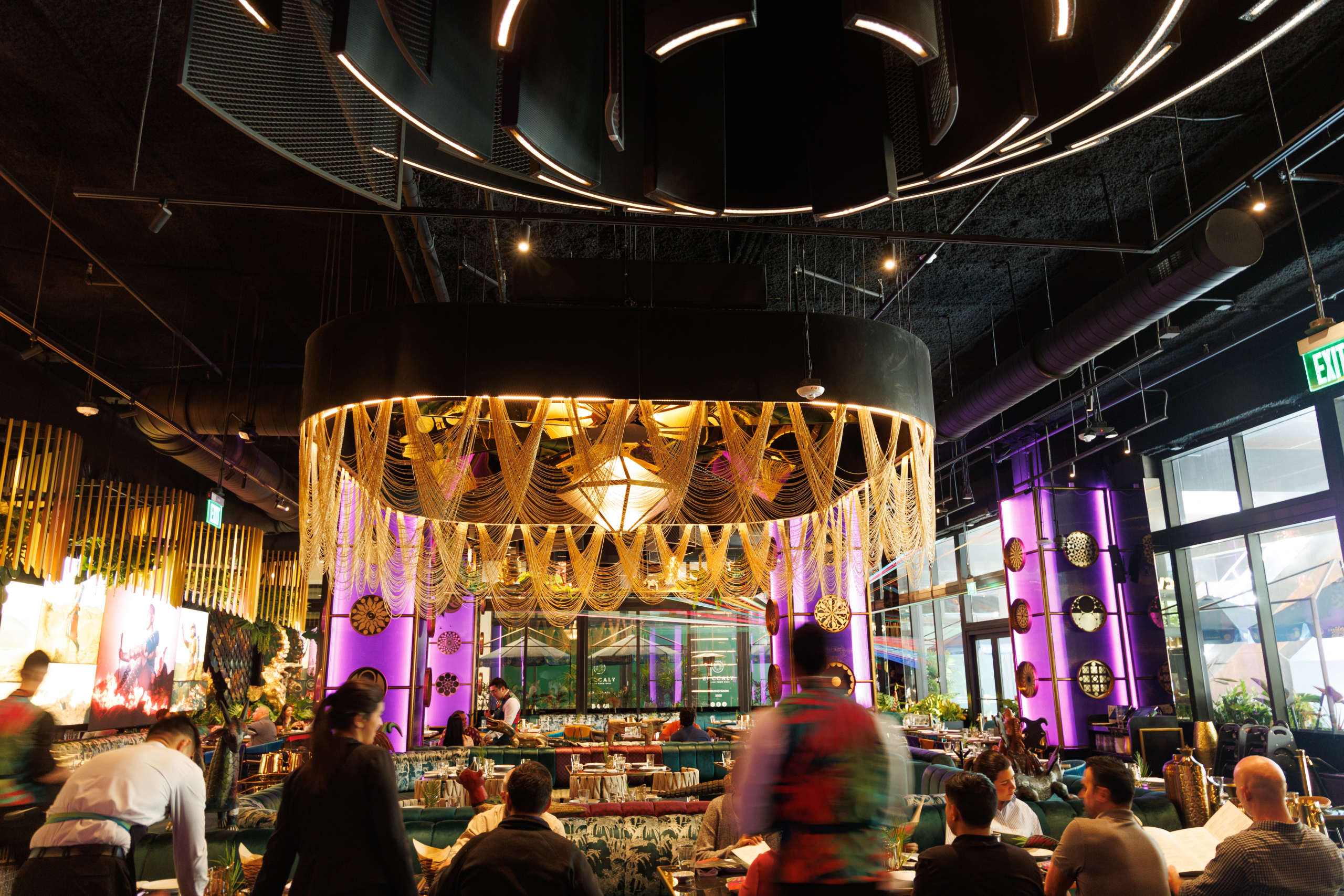 From there we walked to another restaurant housed in the main north tower of The Plaza Coral Gables: CVI.CHE 105. It’s the flagship of this regional chain, with a stunning, cavernous interior that feels like a Hollywood movie set. The walls are adorned with back-lit photos of green scaled fish, blue mermen, and Peruvian warriors, the interior columns illuminated purple with gold trim hanging from the ceiling. Over the entrance to the kitchen is a sign of lightbulbs that reads “SHOWTIME.” That says it all, from waiters with vests emblazoned with tropical flora to the DJ ensconced with a high-tech console just off the entrance. The whole scene is larger than life.