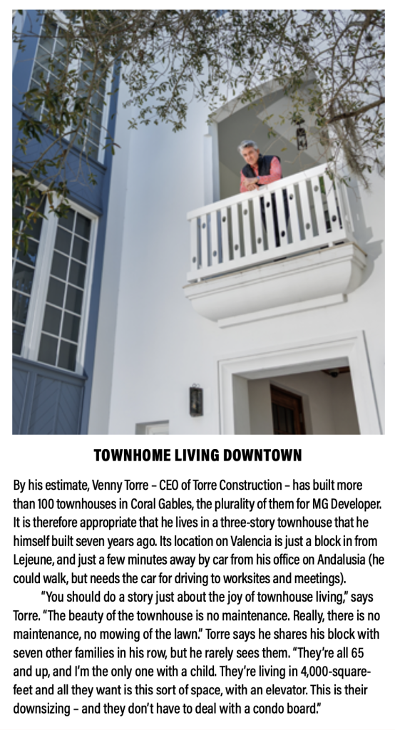 “The beauty of the townhome is no maintenance,” says Venny Torre, of Torre Companies, which has built most of MG Developer’s townhomes. “Unlike condominiums, there is no board drama. No elevator politics. No $5,000 monthly association fees.” In the seven-unit enclave of townhomes where Torre lives, most residents are 65 and older, moving from large homes into 4,000-square-foot townhouses with elevators. “This is how they downsize,” he says.