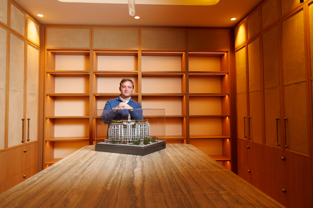 What The Allen Morris Co. is betting on is permanence. President Spencer Morris, who is overseeing the project, calls the 58-unit boutique condominium a “100-year” legacy project. “We refer to it internally that way, something that’s going to stand the test of time, architecturally and from an actual build standpoint,” he says. The firm spent more than a year in the concept design phase, thinking through all the permutations and details, from the interior woodwork to the stone selections. The building’s base, for example, is clad in Roman travertine from the same quarry used for the stone in Rome’s Colosseum. Each unit has a private elevator foyer and mail is delivered directly into private spaces. The rooftop includes a lap pool, Zen pool, cold plunge, and member’s bar, and the building is topped by a cupola that gives it a distinct look.