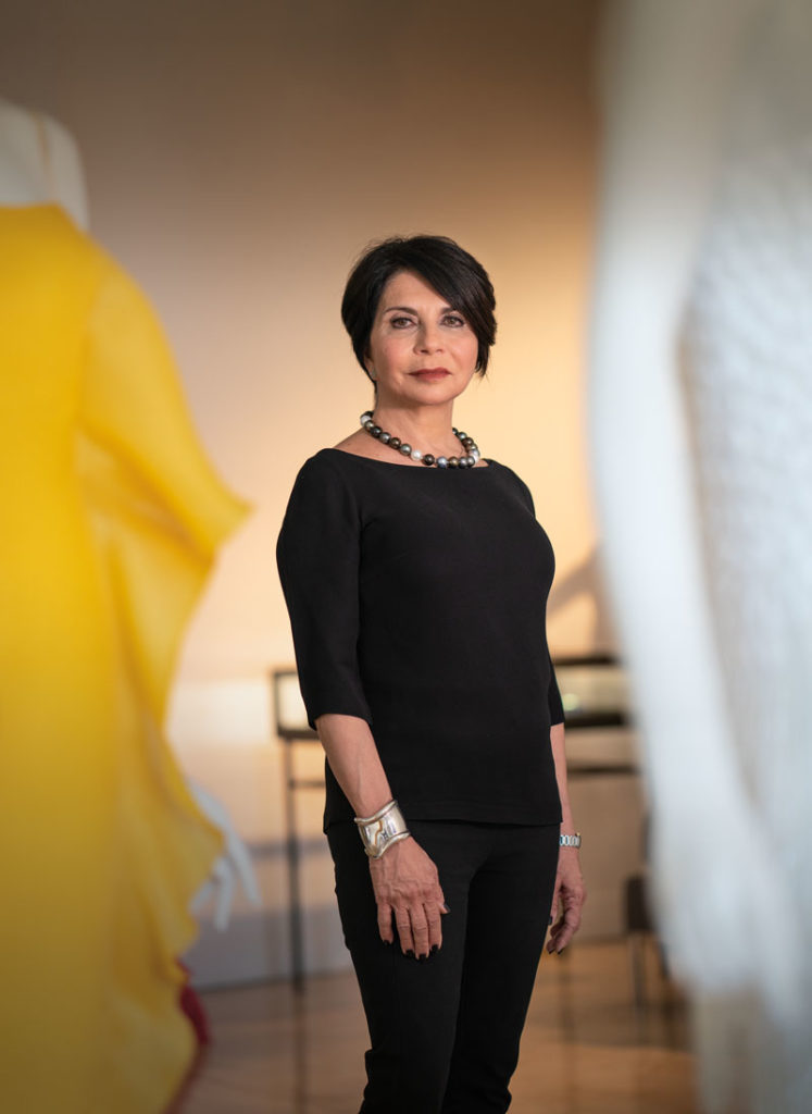 Mayda Cisneros began designing blouses in New York City in the 1980s, where she lived in a loft studio in Soho. As an artist, she made her own fabrics and used tie dyes. One day in an art gallery she met Geraldine Stutz, president of the original Henri Bendel store on Fifth Avenue, who admired Cisneros’ shirt. “I must have been 20 years old. I said, ‘I made it,’ and she said, ‘Why don’t you come and see me?’”