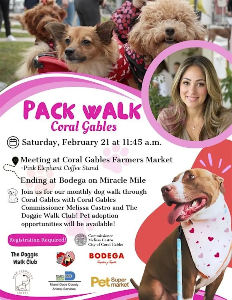 Join Commissioner Melissa Castro and The Doggie Walk Club for a free monthly community dog walk through Coral Gables every second Saturday. Meet at City Hall (Pink Elephant Coffee trailer) for check-in and a courtesy pup cup, then enjoy a 2-mile stroll along Miracle Mile and Giralda Avenue. The walk ends with a social hour at Bodega Taqueria (food and drinks available for purchase). Highlights include mini dog portraits, goodie bags (while supplies last), and adoptable dogs from Miami-Dade Animal Services.