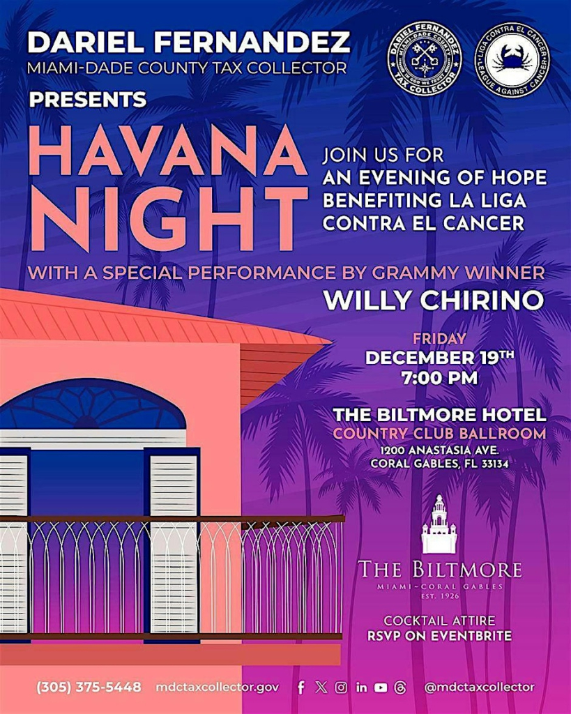 Dariel Fernández presents An Evening of Hope, a fundraising gala supporting La Liga Contra el Cáncer. The evening brings together dinner, drinks, and a live performance by Grammy Award–winning artist Willy Chirino, alongside community leaders and supporters. Designed as the launch of a new annual tradition, the event centers on philanthropy, connection, and collective impact.
