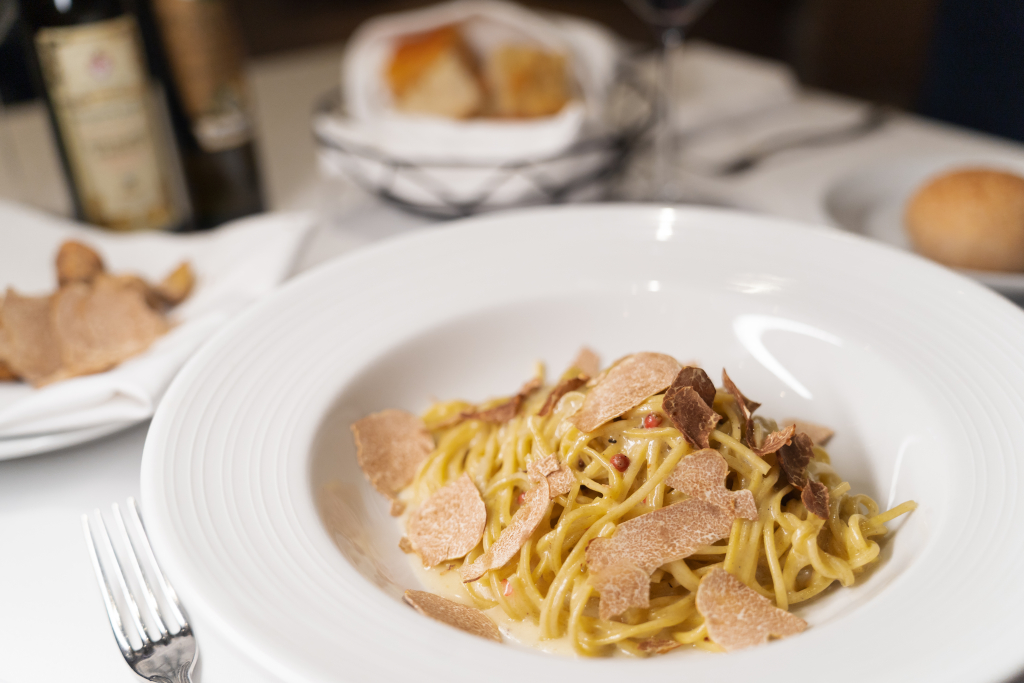 Fontana at The Biltmore presents a four course menu centered on seasonal white truffles, with optional wine pairings selected to complement each dish. The experience begins with a poached egg served with potato foam and parmesan crumble, followed by tagliolini prepared with vanilla, butter and pink pepper. The third course features an NY strip with charred shallot, celeriac and jus. Dessert includes a warm white chocolate ganache with almond, vanilla ice cream and meringue.