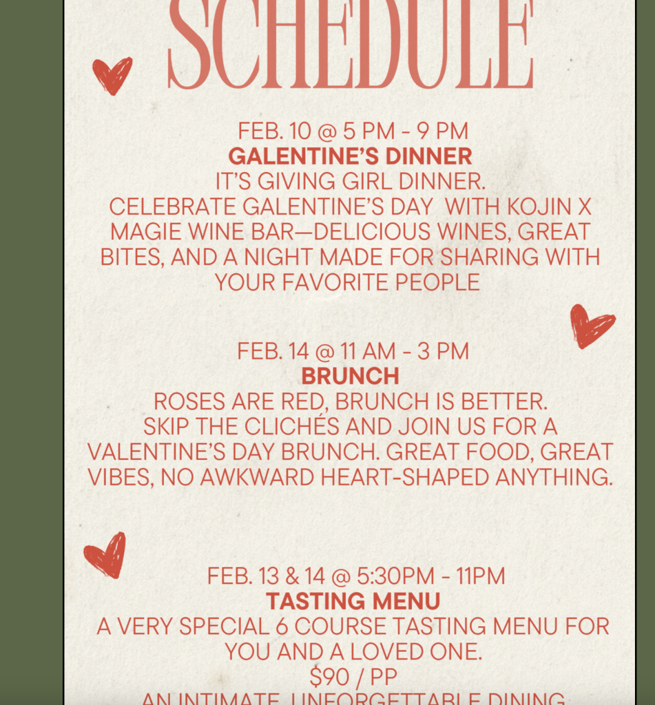 Kojin presents a Valentine’s week lineup of dining events, including Galentine’s, Valentine’s Day brunch, and a multi day tasting menu.