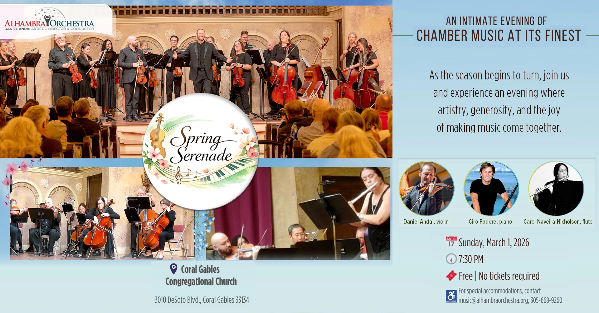 The Alhambra Orchestra presents Spring Serenade on Sunday, March 1 at 7:30 pm at Coral Gables Congregational Church. The free chamber concert features violin, piano, and flute.