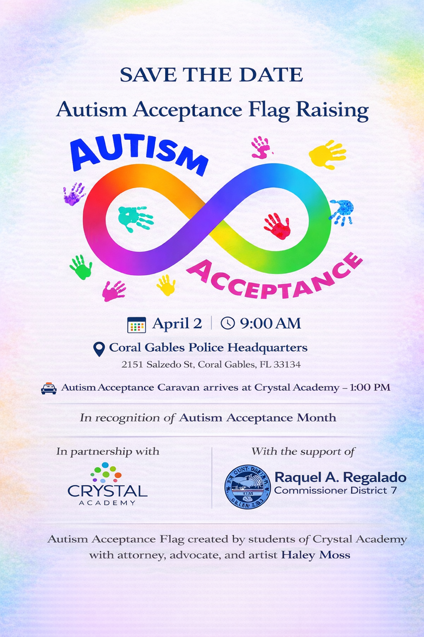 The City of Coral Gables will raise the Autism Acceptance Flag created by students at Crystal Academy, followed by the Autism Acceptance Caravan arriving at the school at 1:00 pm.