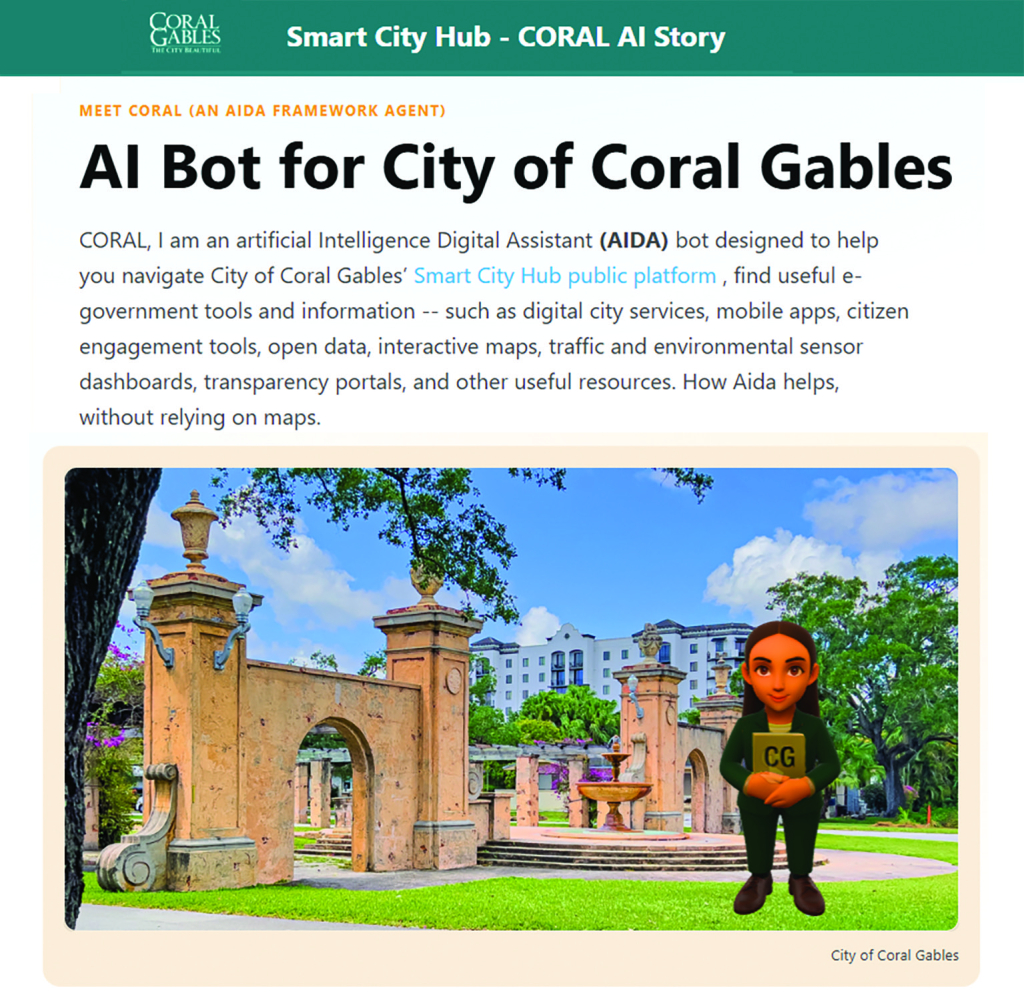 As AI drives change in the Gables, one of the most visible innovations is Coral, the city’s artificial intelligence assistant. Available through the Coral Gables website, Coral functions like an advanced chatbot trained on city information and services. Residents can ask questions about permits, city events, departments, and procedures in plain language. Instead of navigating dozens of webpages, users can simply ask: How do I apply for a permit? Where can I pay a fee? What events are happening this weekend? Coral pulls answers directly from city websites, procedures, and data, using generative AI technology similar to ChatGPT.