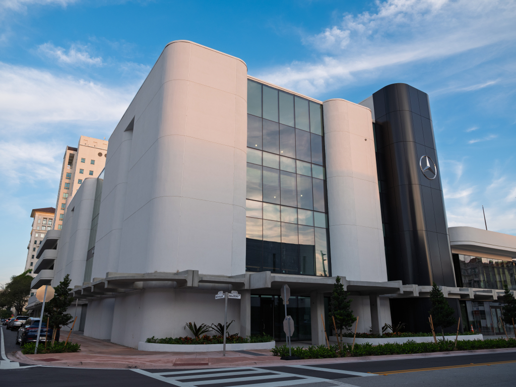what is known as Brutalist architecture, the building was saved by Bill Ussery Motors, which operated the Mercedes-Benz dealership across the street. The building had been bought by developer Armando Codina, but he swapped it with Mercedes for a nearby property where he could build his Regency Parc luxury apartment building. Mercedes then converted it to offices and a parking garage for their inventory, painting the tawny concrete structure white as part of its transformation.