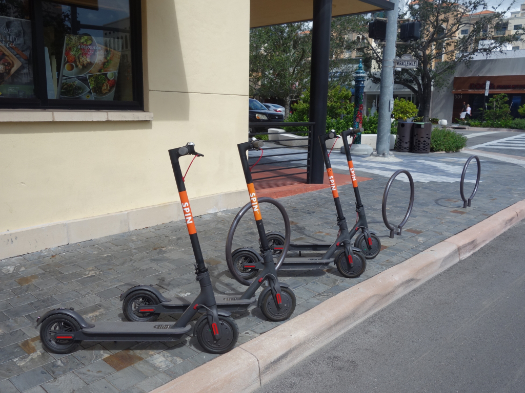 Electric scooters are available at random locations around the downtown and the Merrick Park district. Two companies, Spin and Bird, provide some 200 of these micromobility devices, typically charging $1 to unlock plus about 15 to 39 cents per minute to ride. The speed is capped at 15 mph, and they are not allowed on Miracle Mile or Ponce de Leon Blvd., but they can be dropped anywhere (at night they are collected are recharged). Last year, there were 180,000 scooter trips in the Gables.