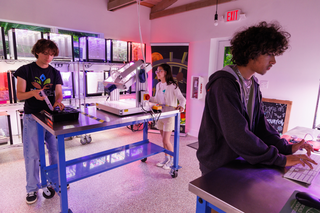 Here in the Gables, they also beta test equipment, which is sent to schools around the world. Most of the researchers at Fairchild are seniors from Miami’s Biotech High School, which partners with the Garden. After taking introductory botany courses, students can spend hours each week working inside the Innovation Studio as part of their curriculum.