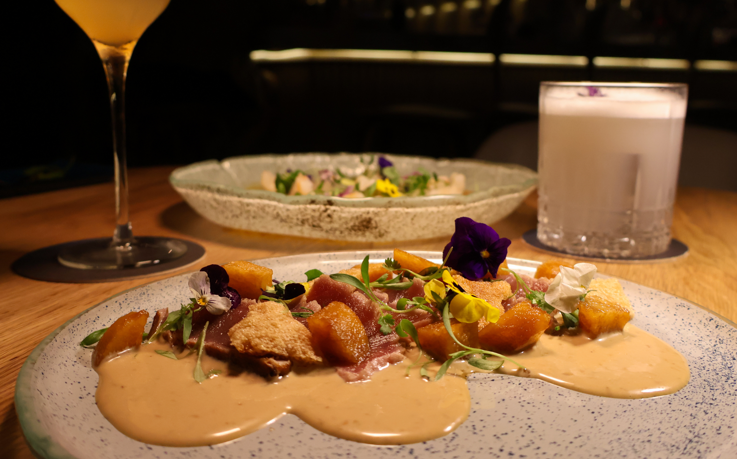 Moving onto the crudos, we indulged in the Sachi of the Sea ($26), composed of fresh shrimp and scallops and served with charred avocado, coconut milk, and a delicious citrus passion fruit sauce. The star of the night, however, was the Tuna Sumibiyaki ($22), made up of thin slices of tuna laid in a creamy sesame sauce and topped with Asian pear and more cassava chips.