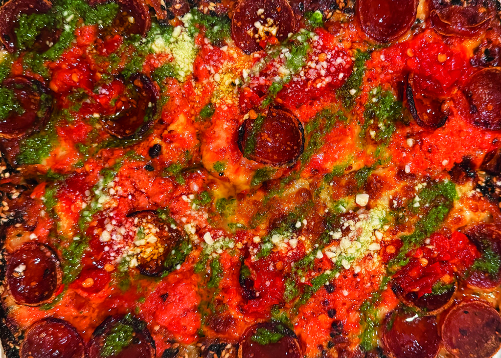 Emmy Squared advertises its pizzas as Detroit-style with a New York twist. The VIP pizza ($24) is one of our favorites: a thick square-cut ‘za with a crunchy sesame seed crust smeared lightly with homemade vodka sauce and topped with parsley pesto, pepperonis, and Calabrian chilies, which give it a special “oomph.” One of the few spicy pizzas that doesn’t rely entirely on jalapeños, we’d give this VIP a 10/10.