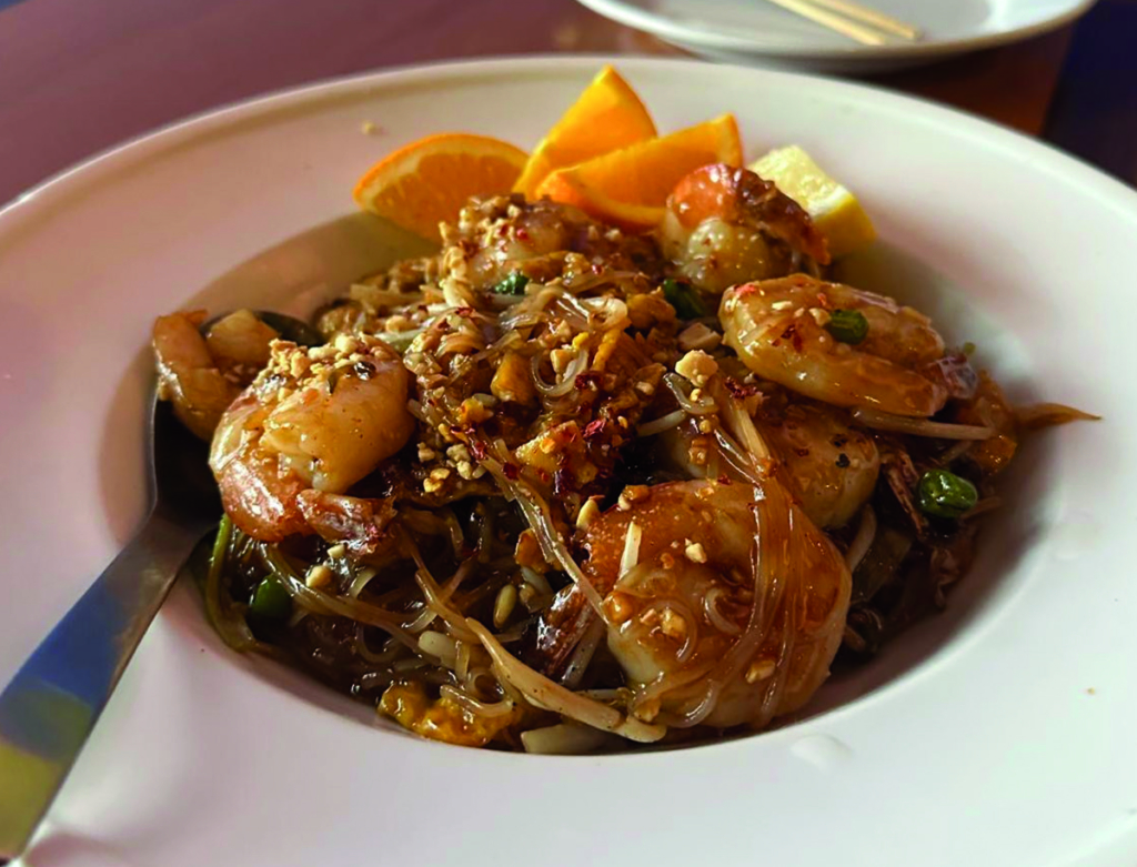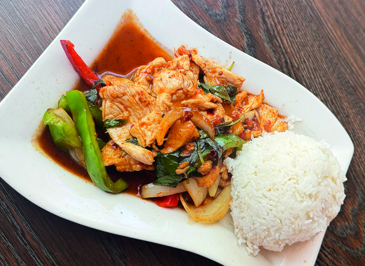 Malakor’s Pad Mee Ko-rad ($20) is a flavorful stir-fried noodle dish with tamarind sauce, shrimp, egg, peanuts, scallions, pickled radish, and beans. You can choose your heat level from one to five or ask for extra spice on the side to adjust as you go. Five is blistering, we’ll tell you right now. So, try a mild level one or two and see how it enhances things.