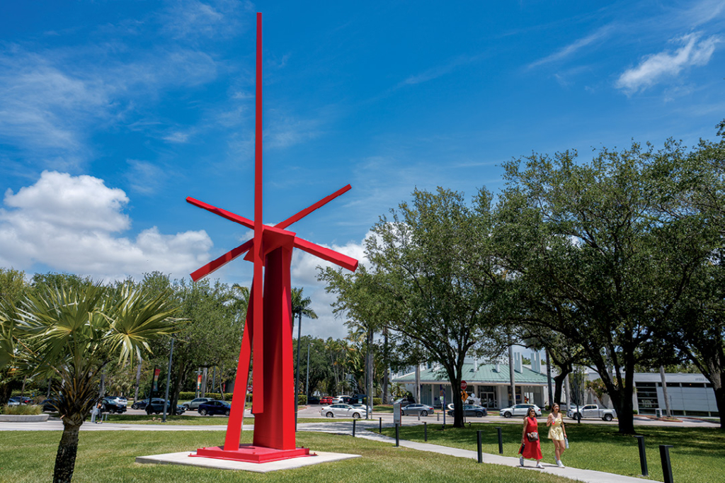 The University of Miami recently held a reception for the unveiling of “Lady,” a 50-foot steel sculpture by American artist John Henry. Painted in Coca-Cola red and installed in front of the Lowe Art Museum, the piece – valued at $900,000 – now stands as one of the most visible additions to the university’s growing collection of outdoor art. The sculpture was a gift from the Palley family, which has supported the arts at UM for decades. Known for their role in bringing large-scale works to campus, the Palleys have helped shape an environment where students and visitors encounter art in everyday spaces: on walkways, near lecture halls, and across green lawns. “Lady” continues that tradition.The event, which brought together faculty, students, and community members, was both an unveiling and a moment to acknowledge the Palleys’ ongoing impact on the campus landscape. Family scion Lisa Palley says “Lady” is meant to be more than a sculpture, but also a point of reference, rest, and inspiration. “She [the sculpture] is so happy to be home, to welcome everyone to the University of Miami campus, and will always be there,” said Palley, “as a place to meet up, a place for repose, a place to think, to dream, to reach for the stars.” The event was co-hosted by the Lowe Art Museum and the College of Arts & Sciences. – Amanda Martell