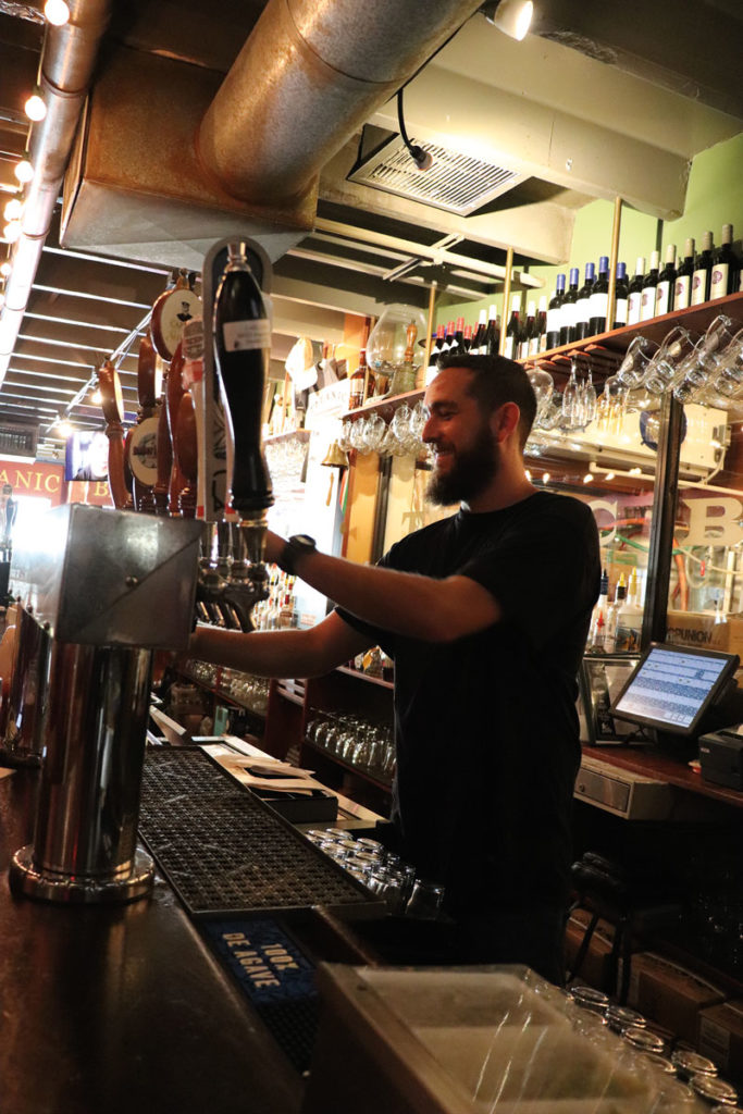 From 4 p.m. to 7 p.m., the pub serves house beers for $4 and house wines and well drinks for $5. But one drink clearly steals the show. “People come here for the beer,” Rusk says, who describes his restaurant as a “brew pub,” or a pub that makes its own beer.